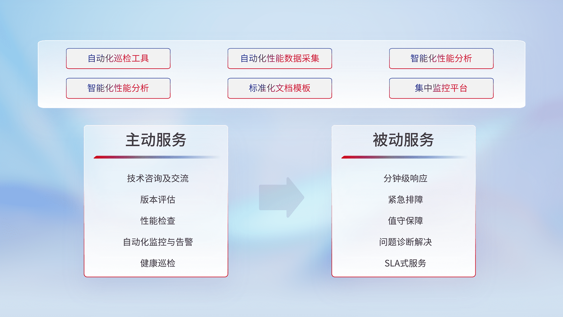 智能化工具和标准化文档,,保障服务质量,,,提供主动服务(包含技术咨询、、版本评估、、性能检查、、自动化监控与告警、、、、健康巡检)和被动服务包含(分钟级响应、、、、紧急排障、、值守保障、、问题诊断解决、、、、SLA服务)。。。