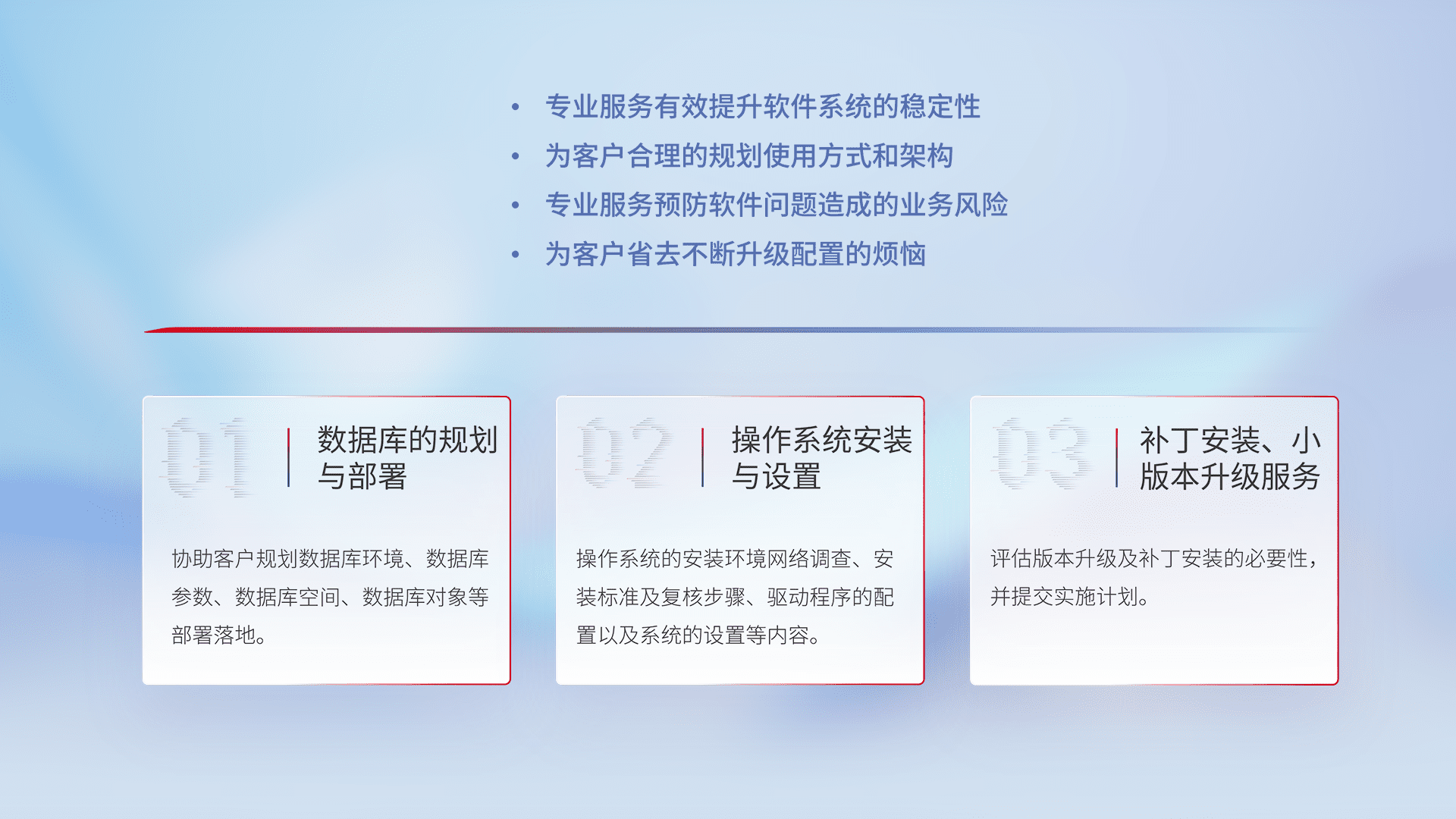 为客户提供软件规模升级、、、、快速部署、、、、按需配置的专业服务,,,从数据库的规划与部署到操作系统的安装与设置,,,再到补丁安装和小版本升级提供支持。。。。